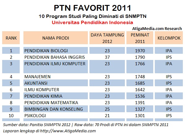 Peringkat 10 Prodi Favorit di Universitas Pendidikan Indonesia adalah sbb: